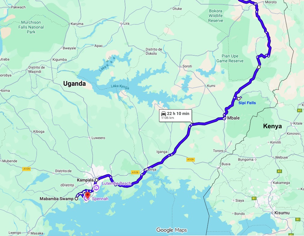 Ruta des de Juba (Sudan del Sud) a Entebbe (Uganda) passant per les Sipi Falls