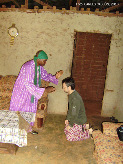 És una mena de benedicció i també et dóna «protecció«, segons em va explicar l’Ousseni. Ell, jo i un altre personatge de Somalomo que ens acompanyarà (un tal Papa Charles, policia jubilat i responsable del Grup de la Comunitat-GIC, o alguna cosa semblant) passem, un per un, pel ritual, i després és hora d’asseure’s al menjador i acabar el tràmit amb una breu conversa que es tanca amb una encaixada de mans… i els 3.000 CFA.