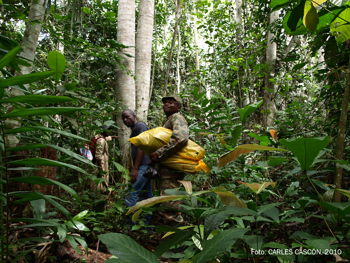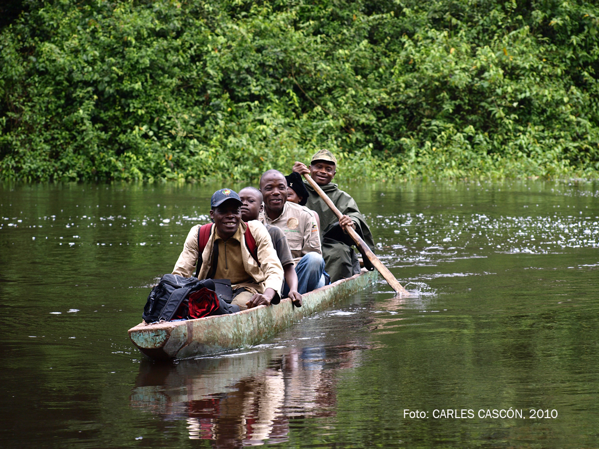 Faig comptes i, a banda dels calés que m’estic deixant aquí, la comitiva em resulta un pèl desmesurada, quasi còmica: l’Usseni, la Jolie, el Papa Charles, el Siriku i el guia de l’ECOFAC per acompanyar només un blanc com jo, ummmh. M’estan prenent el pèl? Sense comptar els portadors, que ja han sortit i després ens creuarem amb ells al mig del bosc poc abans d’arribar al campament. Em temo que ja és massa tard per re-negociar el número d’acompanyants, així que enfilem cap a la reserva…