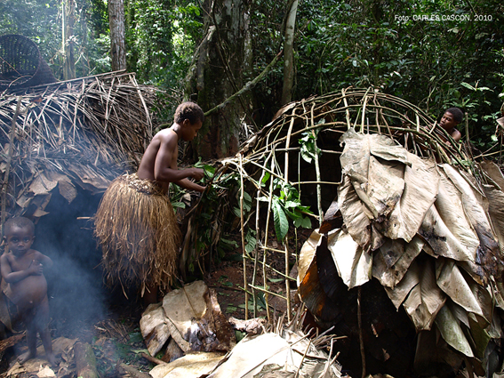 Sense més contratemps, arribem al conjunt de «mungulos» dels Baka, una petitíssima comunitat entre arbres molt alts, que tapen la llum del sol. Amb el fum dels petits focs (en realitat, troncs que fan brasa), l’ambient es fa dens al mig de la selva. Saludem les poques dones, nens i un parell d’homes que són en aquell moment al campament. Tots els altres són de cacera i tornaran a partir de les 5 de la tarda, poc abans que es faci de nit. Han de portar el sopar del dia, carn fresca (o no tant fresca, però d’això en parlaré més endavant…).