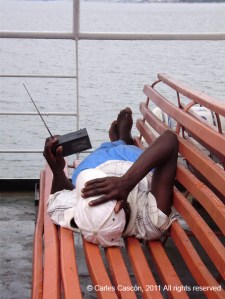 Erem unes 12 o 15 persones a coberta. Dos marroquins portaven un ordinador portàtil i veien una pel·lícula. Pels crits que se sentien vaig descobrir que era una porno. Algú més es va afegir a la projecció. Durant el trajecte vam veure les illes Elobey Grande i Elobey Chico i, a mà esquerra, la costa de Gabon (Cocobeach).