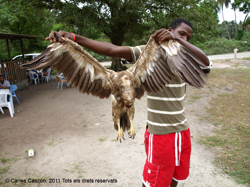 Ja al vespre, a casa, hi ha menú sorpresa per sopar: àguila. És la que he vist a la tarda en mans d’un guineà que l’acabava de caçar. Poc em pensava que acabaria al meu plat quan li he fet la foto davant del bar de l’alcalde.