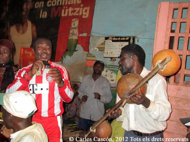 Foumban es va transformar, també, i la primera parada a un petit local de “música tradicional” va ser una catarsi de ritmes i cants hipnòtics entre un públic cerveser que començava a acusar els efectes de les Castel de mig litre que omplien les taules. Tot un contrast. L’atmosfera etílica d’aquella cantina fosca, amb parets brutes de blau cel descolorit i pósters de Mützig estripats, amagava uns músics sorprenents.