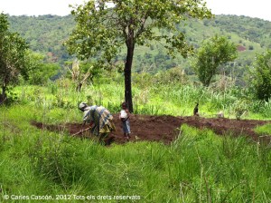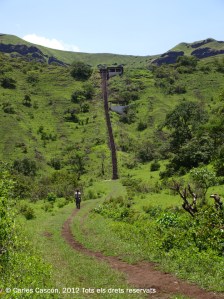 Al llarg de l’excursió ens hem creuat amb gent, sovint nens, que baixen de la muntanya carregant troncs al cap per cuinar. També hi ha dones que han pujat fins aquí amb un magalló i passaran el dia conreant uns quants metres quadrats de terra per al consum propi, bàsicament. Sovint s’emporten un fill petit que es passarà la jornada sencera al camp amb la mare, sospito que amb poca cosa per menjar i beure. Per això la Liliane ha tingut el detall de donar-li una madalena a una nena que ens hem trobat pel camí, amb la seva mare.