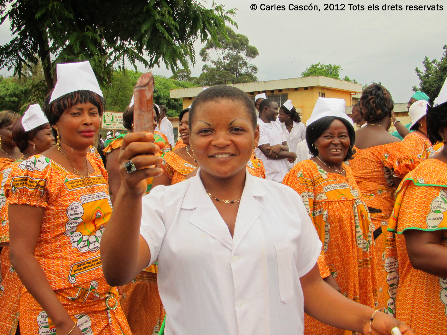 Per últim, un grup d’infermeres (o metgesses, o farmacèutiques), passen amb el seus gorros blancs, portant medicaments. Al mig, una dona exhibeix un gran penis de fusta amb un condó posat. És el vessant pedagògic del Dia del Treball al Camerun. No llencen paquets de condons, però. De fet, si les metgesses són tant de fiar com els fotògrafs o els banquers, millor seria no agafar-los…
