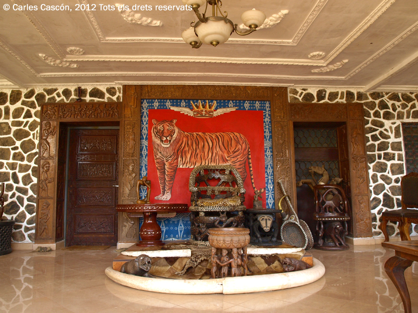 Un pèl estressat, amb el front suat i les explicacions apreses de memòria molt accelerades, el guia ens deixa veure la sala de recepcions on hi ha un vistós, efectista, pel·liculero tro amb espectaculars pells de lleopard. Llàstima que tot estigui molt desordenat i encara no han recollit les safates de l’últim pica-pica…