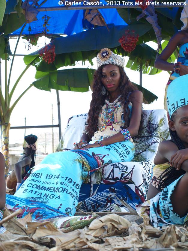 Un rato más tarde, la rua oficial se prepara y las carrozas toman posiciones. Descubro, por fin, la famosa “Reine des Eaux” (Itongo Mayi), la Reina de las Aguas. Es la joven sirena, recostada en su trono, tocada de una corona de caracoles de mar y pendientes de concha. Le acompañan, entre palmeras y bajo un toldo azul que portege del sol, cuatro niñas sentadas y una chica de pie más mayor. Un cartel pintado recuerda la divinidad del mar que representa.