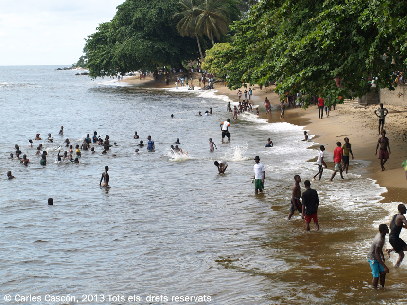 No me pierdo después, eso sí, el “baño popular” en la playa del hotel Palm Beach, donde ya me habían avisado de no acercarme demasiado a la arena bajo peligro de acabar en el agua junto a decenas de jóvenes fiesteros. Teniendo en cuenta que llevo cámara y objetos personales, me sitúo en un discreto mirador para inmortalizar el feliz colofón del carnaval de Kribi.
