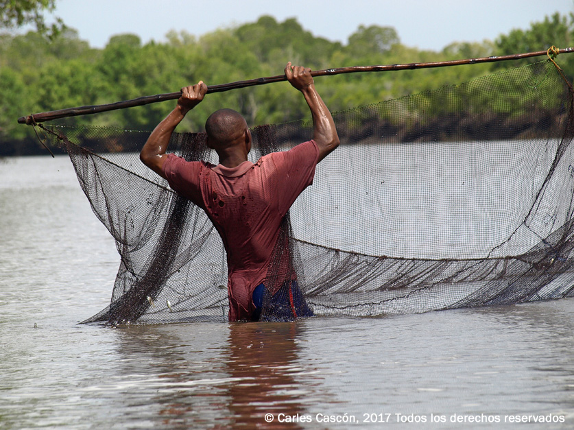 No muy lejos de allí, nos encontramos a los primeros pescadores echando sus redes metidos en el río hasta casi la cintura. No dudan en pescar aquí a diario, por donde se mueve en precarias embarcaciones y a pie entre las gruesas y retorcidas raíces de los manglares, que se clavan en el barro como barrotes. El manglar, como es bien sabido, es uno de los pocos árboles que tolera la salinidad del agua sin problemas.