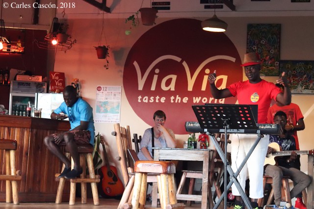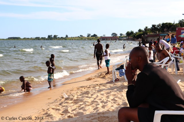 Acabamos el día en otro sitio muy diferente, el elegante Café Javas con su oferta internacional -pasta italiana, tartas de chocolate, etc.- y precios también en consonancia. Me encanta este contraste africano de lo local y lo global, todo muy cerca y en perfecta convivencia. Antes me pasé por una de las playas del Lake Victoria, la Lido Beach. Me sorprendió que se pagase entrada (5.000 UGX, algo más de un euro) pero a cambio tienes vigilancia, lavabos, puestos de pinchos de carne a la brasa, cerveza fría, sillas y mesas en la arena y… música a tope.