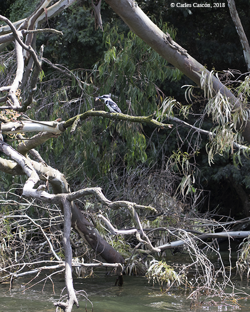 Un Pied kingfisher (Martín pescador pío) con su pesca