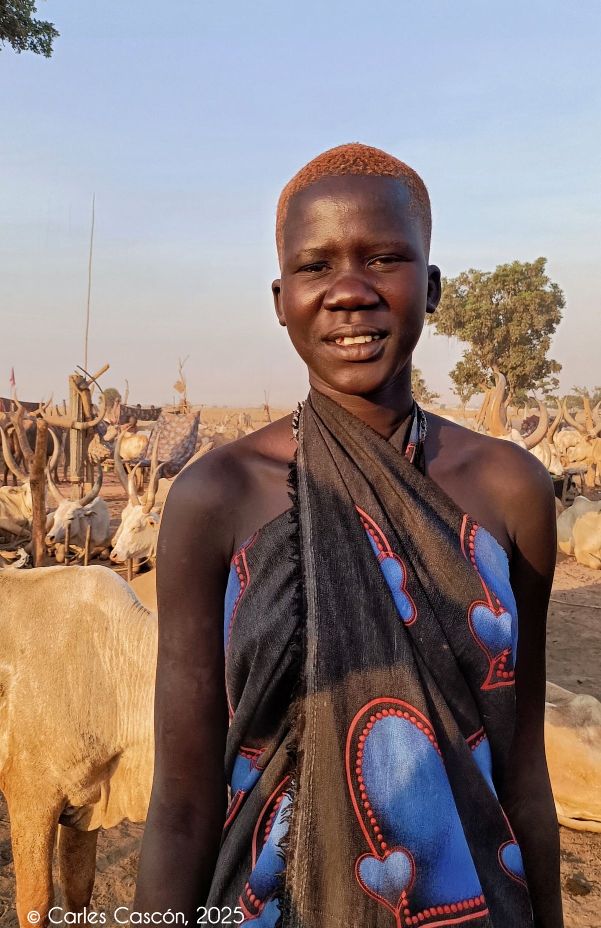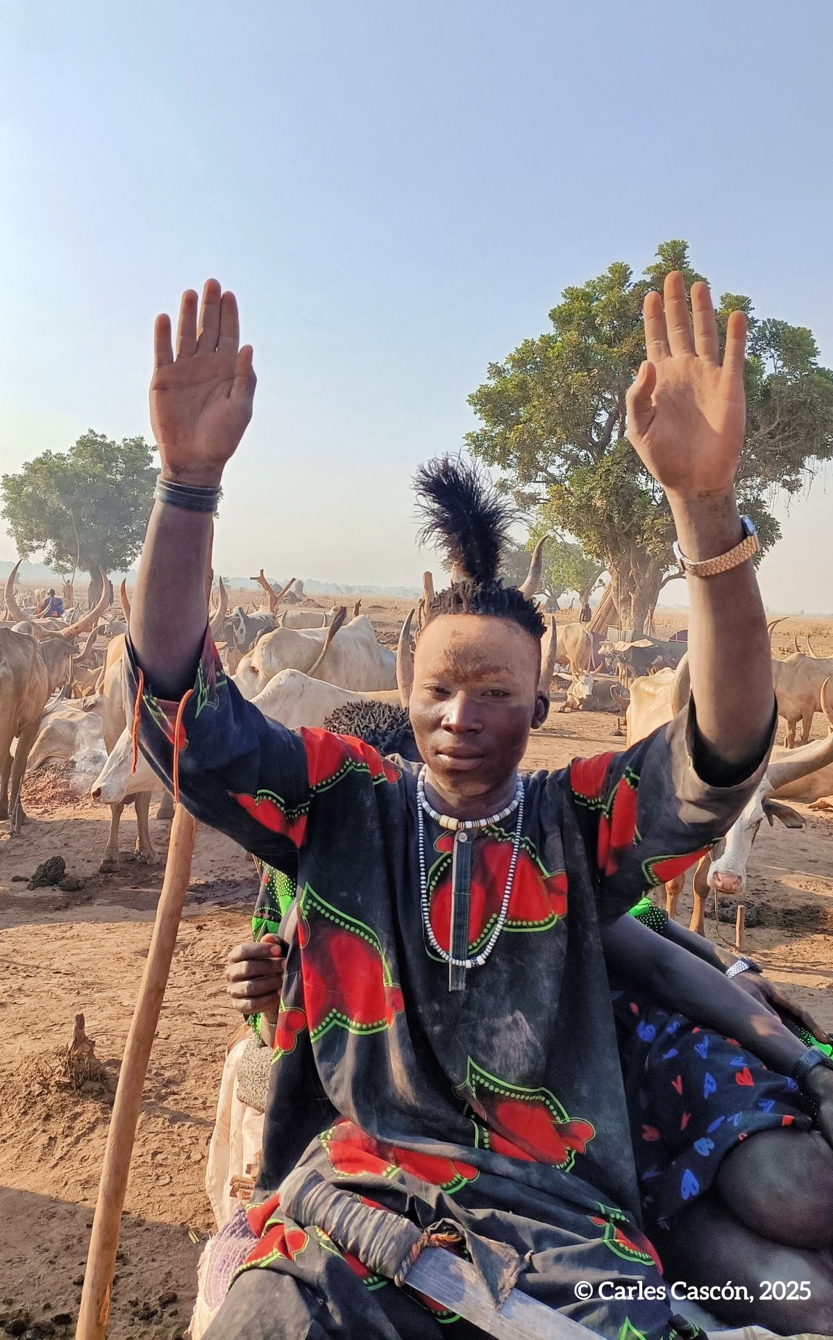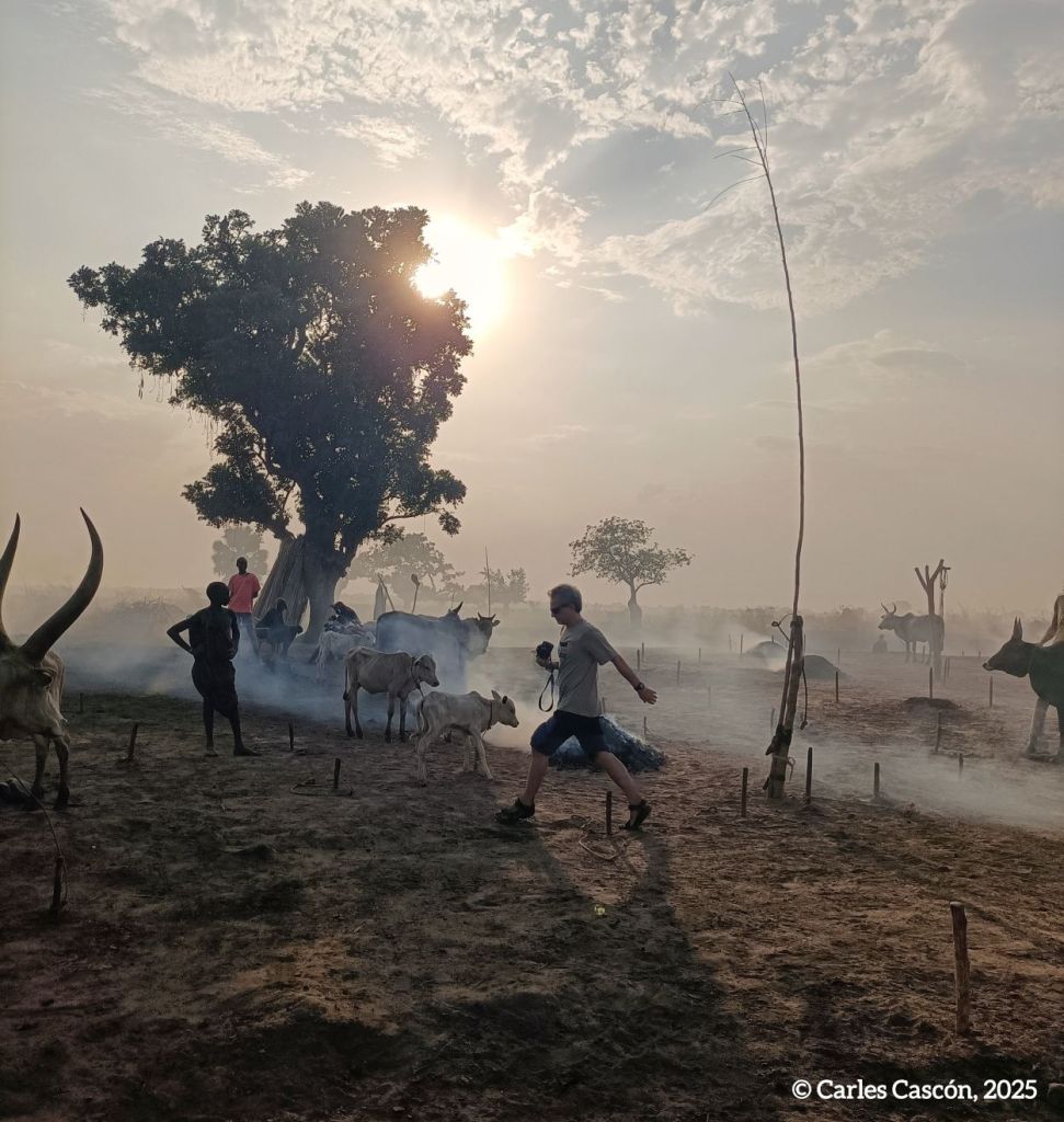 Ens llevem d’hora, a l’alba, per viure les activitats al cattle camp mundari. Anem cap allà quan encara no són les 6 del matí i el campament es desperta entre el mugit de les vaques i de bens i cabres.