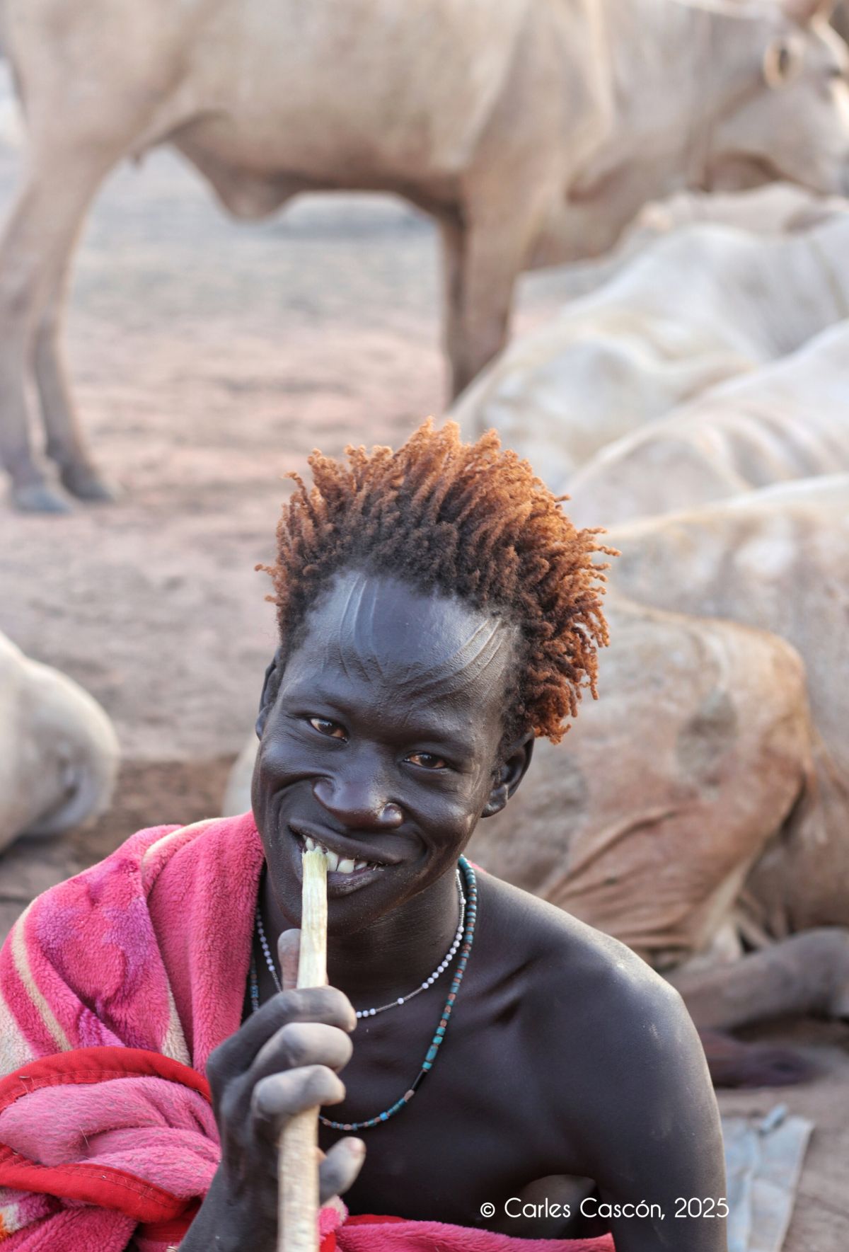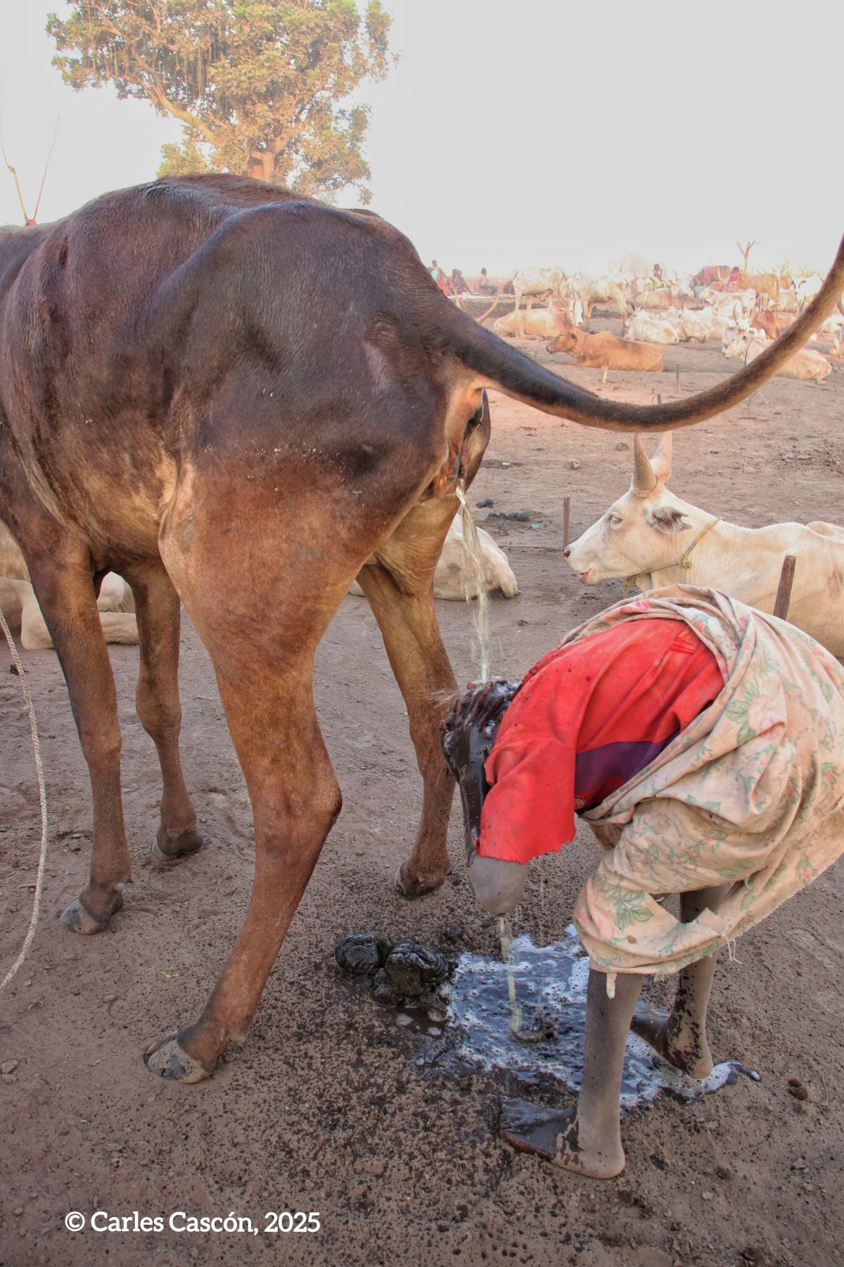 Com se sap, les cendres d’aquests excrements cremats al llarg de la tarda se les posen els Mundari per la cara, els braços i les parts del cos descobertes. Esdevenen una marca estètica d’identitat. També freguen amb cendra i pols les banyes de les Ankole, des de les puntes a la base, recorrent la forma cònica amb dedicació. Després els fan massatges al llom, al cos, durant una bona estona. Per què ho fan? La cendra protegeix dels mosquits (i per tant de la malària) i les mosques tse-tse.
