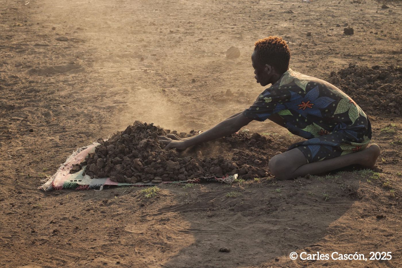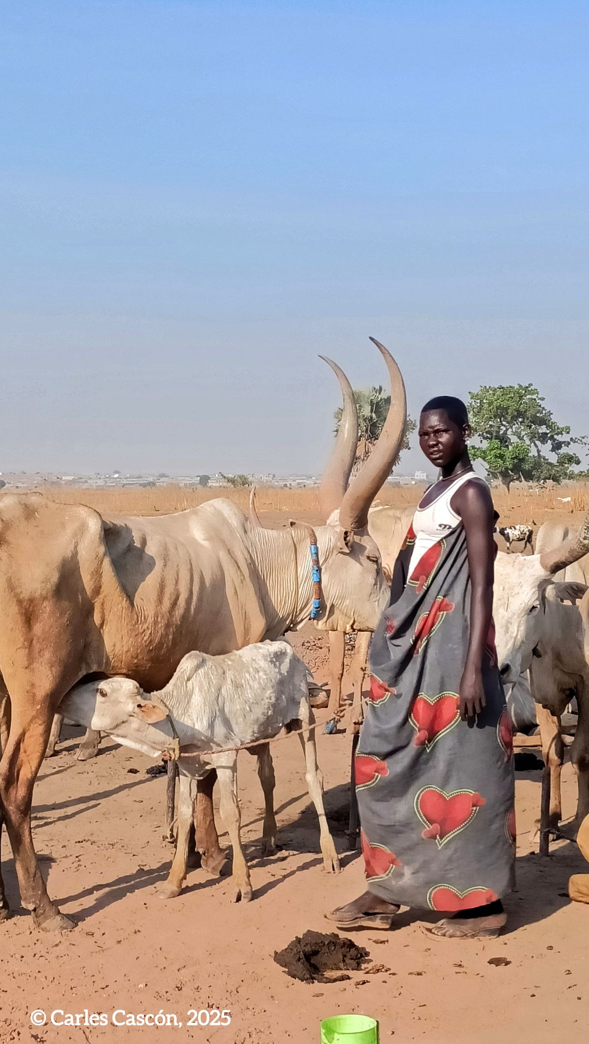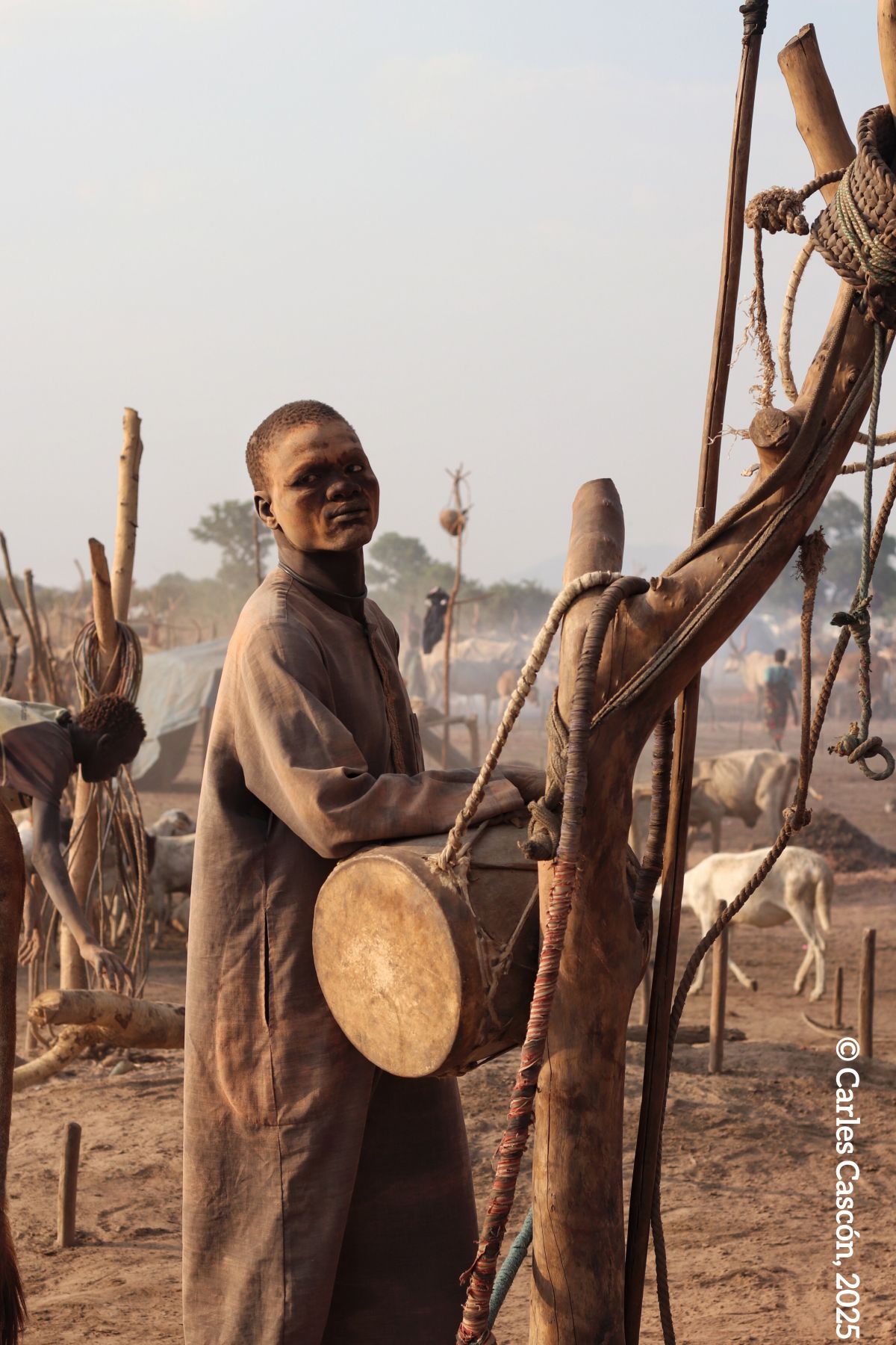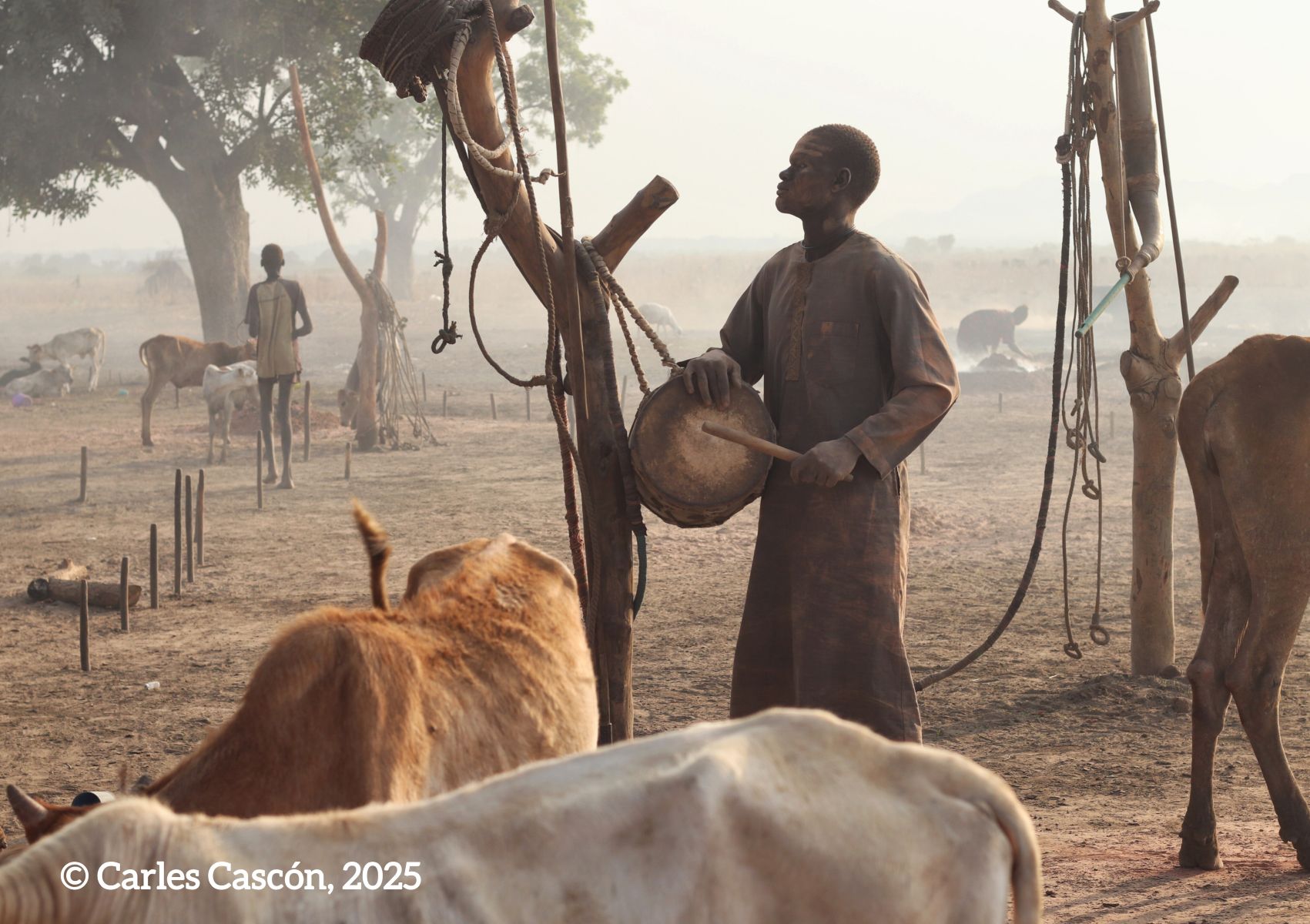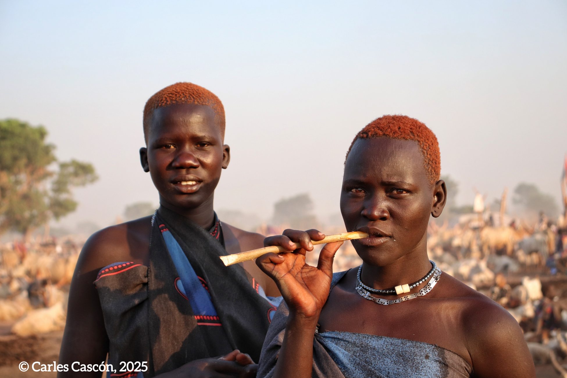 Som a un dels “cattle camps” mundari a menys de 100 km de la capital del Sudan del Sud, Juba, on hem arribat aquesta tarda en poc més d’una hora de carretera i pista en 4×4. La cançó ha estat el colofó d’un capvespre on el campament mundari ens ha embolcallat amb la seva atmosfera de fum omnipresent i vaques a centenars, de muntanyes de fems cremats i cossos coberts de cendra, del so del tambor solitari que guiava el retorn del ramat, la melodia de la banya bufada per un pastor mundari com a toc de retirada…