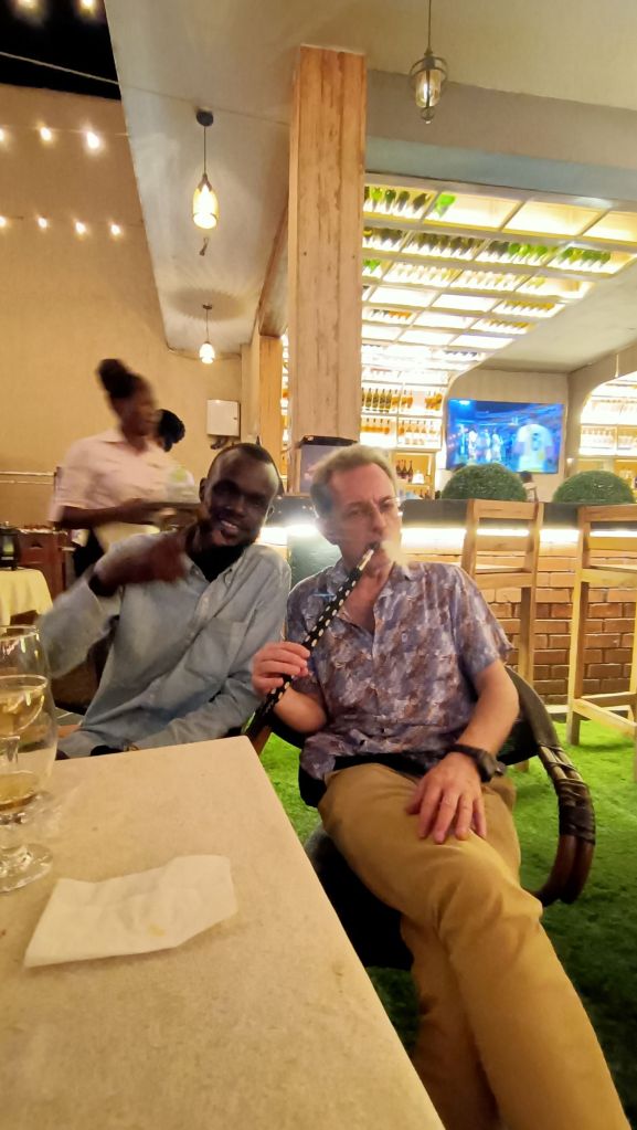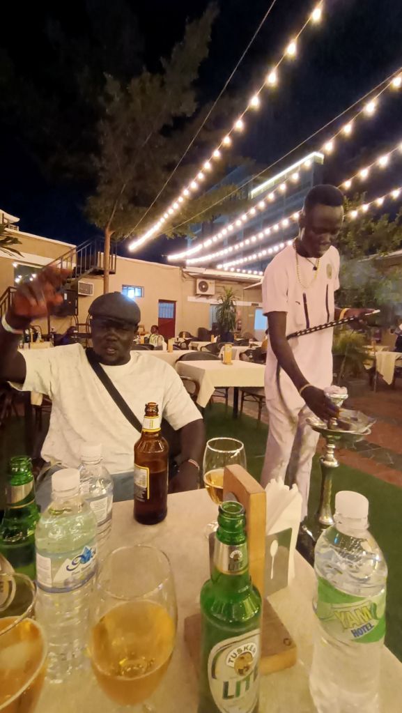 Agraeixo al Nyang la seva flexibilitat, honestedat i transparència en l’organització. O els seus valuosos consells de seguretat. També que ens portés a llocs per rel·laxar-nos i distreure’ns a Juba com: el Baobab House (on vam sopar una barata i deliciosa kisra amb salsa d’okra regada amb una Tusker mentre a una taula veïna uns sud-sudanesos contents de tequila corejaven melodies populars shillok punxades pel DJ); el Mango Camp a la riba del Nil (amb vistes al famós ferry naufragat que mostra mitja proa fora l’aigua); el Yam Hotel (una mena de cruïlla entre restaurant, sports bar i night-club); o el “nigh-club” Fénix, per prendre unes copes, fumar shisha i ballar si es vol fins a la matinada (tot i que entre setmana aquell dia l’ambient era força tranquil). Aquí vam brindar perquè finalment el nostre tour per les tribus havia arribat a bon port (i que els militars no ens van tocar excessivament les pilotes).