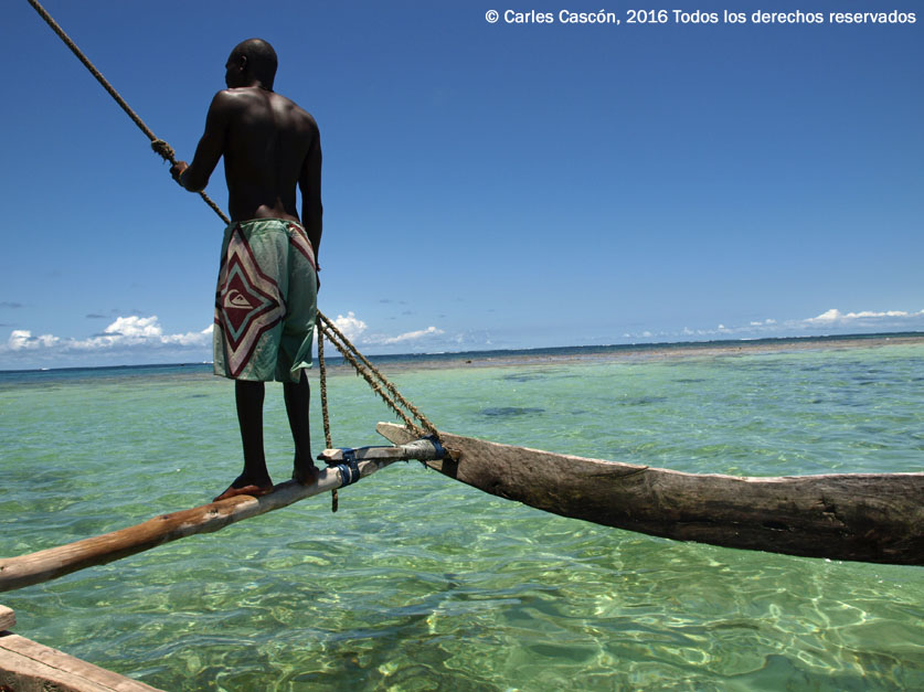 No está muy hablador hoy. La mirada hacia proa bajo su “KOFIA” (gorro tradicional musulmán en la costa swahili), ricamente brodado en muchos colores. El sol cenital esconde su rostro entre una sombra muy oscura, que contrasta con los azules increíbles del mar y el cielo. Me imagino que tiene otras cosas de qué preocuparse. Como ahorrar un poco antes de que los pocos blancos abandonemos Diani casi por completo y empiecen a bajar persianas en muchos hoteles y restaurantes.