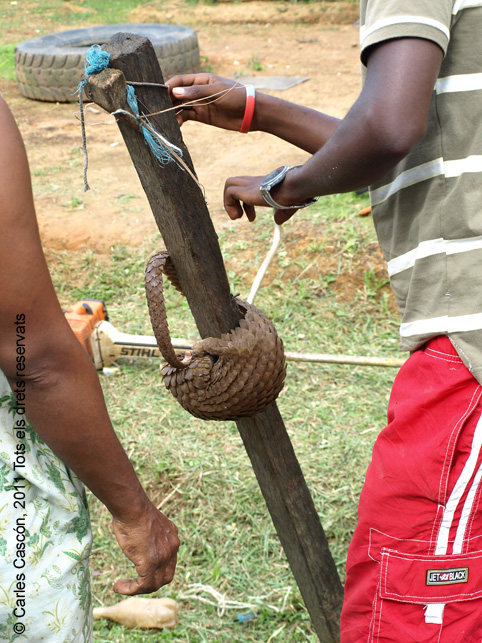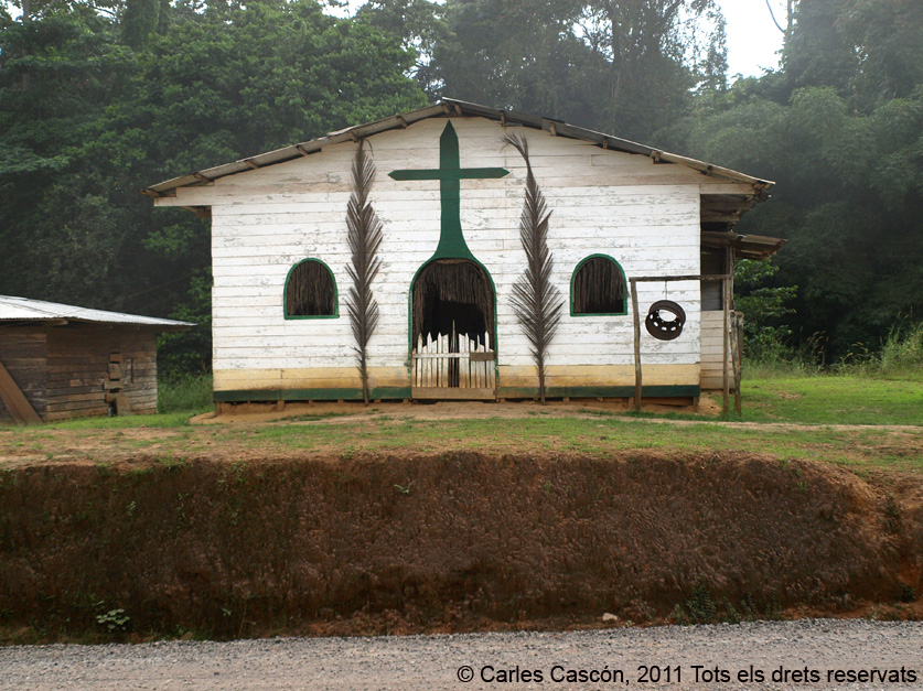 Aquest cop tinc la sort que l’Hinestrosa i alguns treballadors seus van fins a Bata i tenen lloc per mi al tot-terreny: viatjaré còmode i passarem tots els controls sense cap problema. Pel camí faig fotografies a alguns bars de noms curiosos, una església amb una original “campana” reciclada davant la façana i els animals que venen vius a la carretera, com un pangolí enroscat a un pal que aviat acaba dins el nostre cotxe, als peus del copilot.