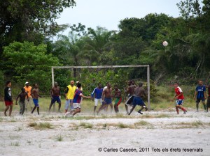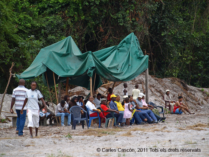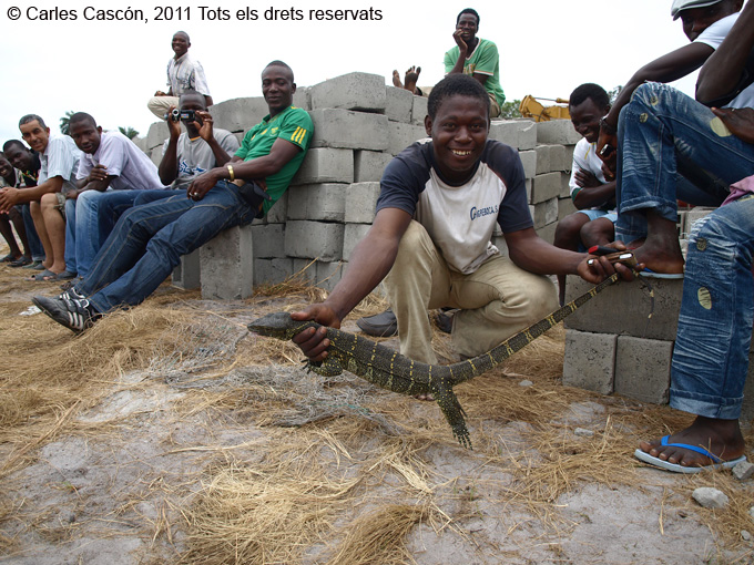 Assisteixo al partit de futbol de l’equip dels treballadors de Somagec (de diferents nacionalitats) i l’equip corisqueny. Em crida l’atenció la llotja, amb el seu tendal mig ensorrat. A la ‘grada’, un espectador apareix amb un rèptil de considerables dimensions que ha atrapat viu i segurament serà el seu sopar.
