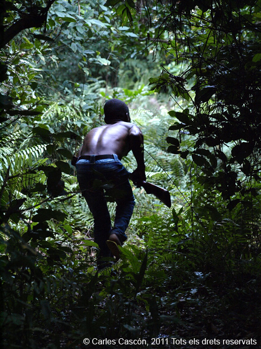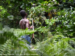 Em convida a caçar “titis” (micos petits) més tard al bosc de darrera la caserna. Arribo tard i ja és de servei però m’hi acompanya un altre. Al cap de poc d’entrar al bosc ja es senten els primers micos entre les branques. També hi ha esquirols. El paio, que va sense camisa, s’hi endinsa una mica, apunta i dispara. El mico ha caigut, assegura, però no el trobem per enlloc. «Es deu haver escapat”, lamenta, i tornem sense trofeu. O sigui, sense el seu sopar.